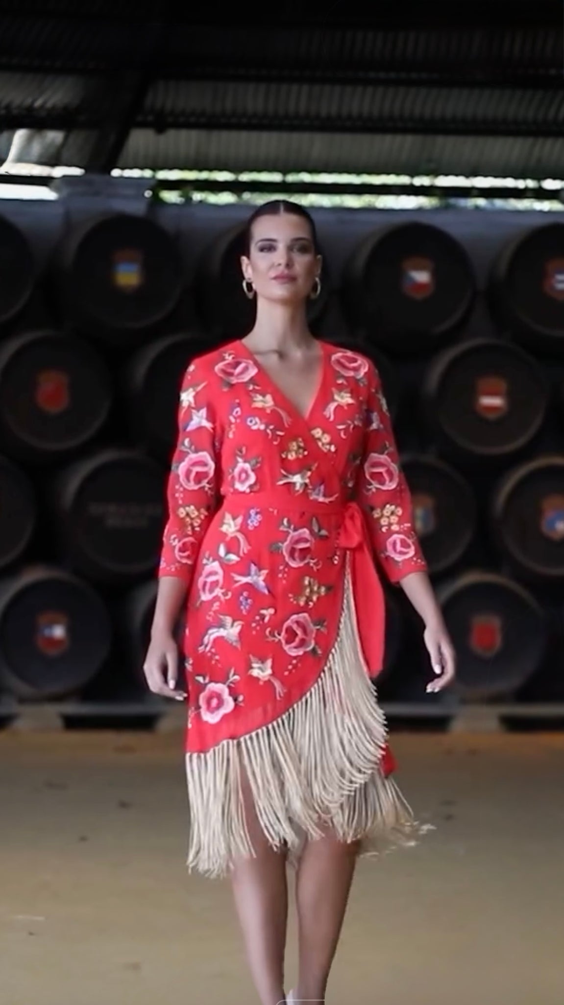 K Embroidery wrap around dress with gold fringe