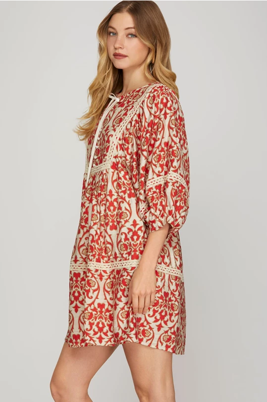 Ss 1/2 sleeve pattern print woven red dress /pockets
